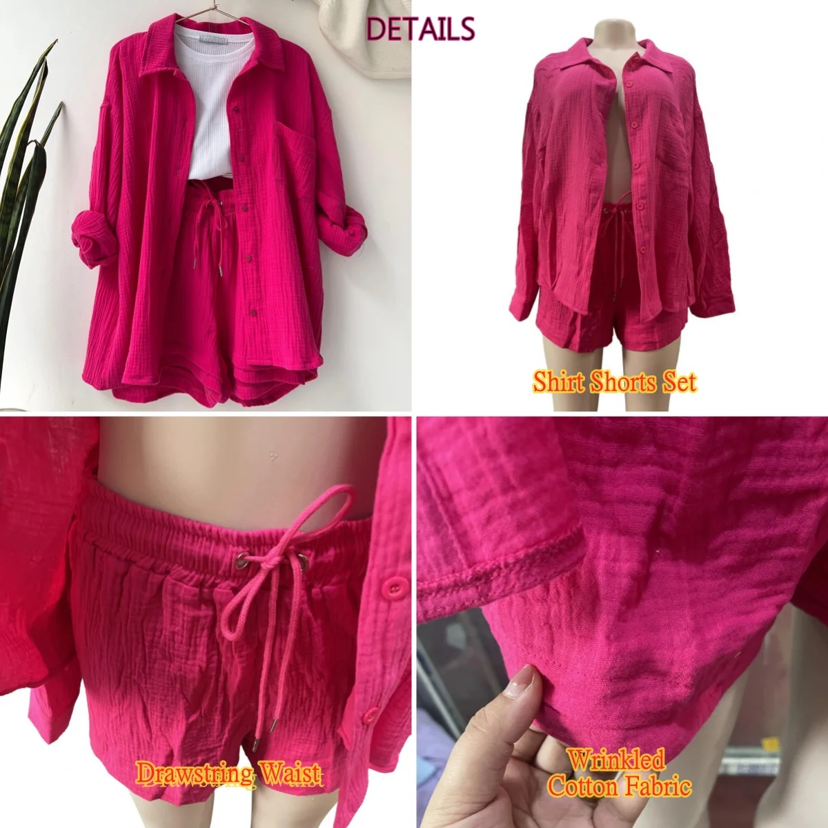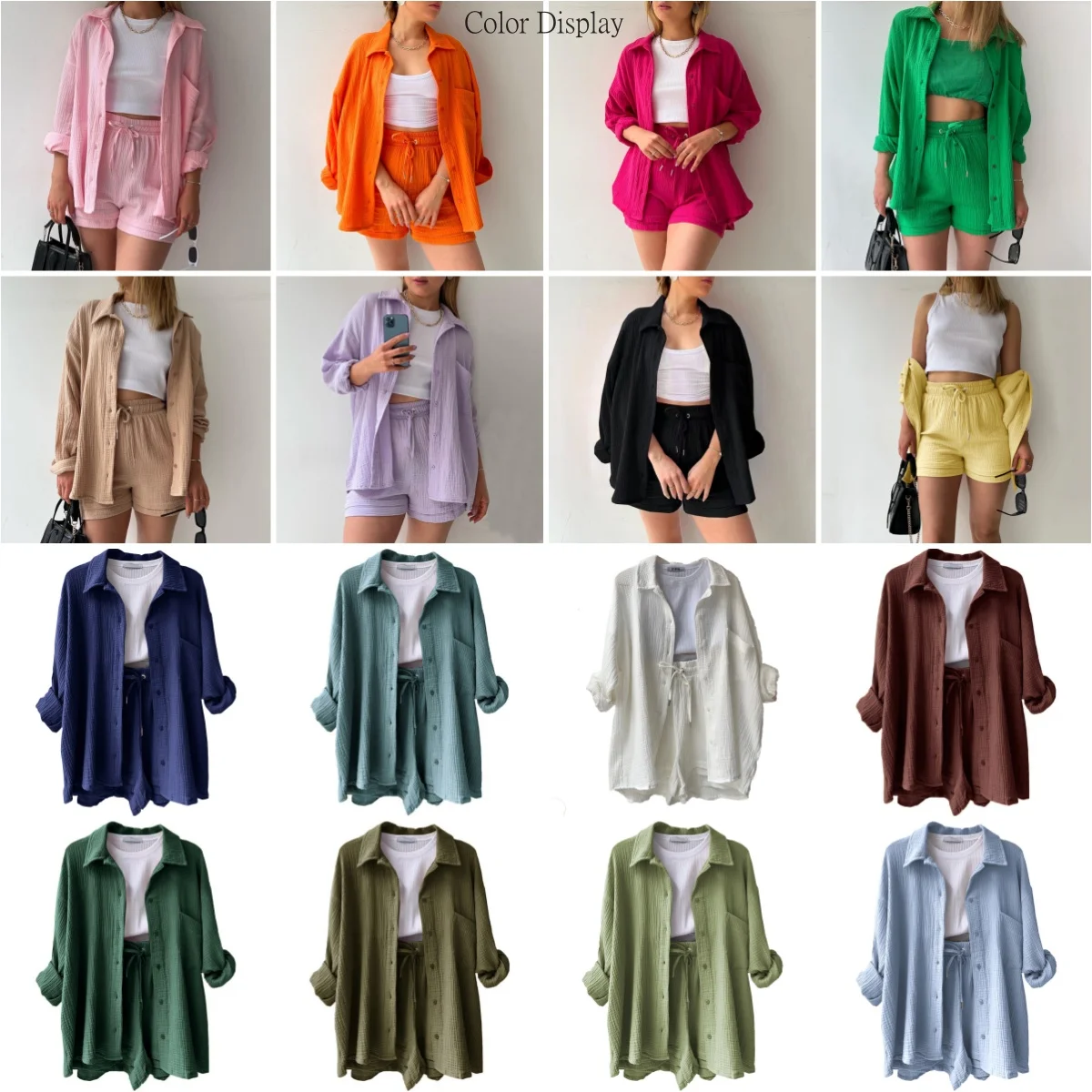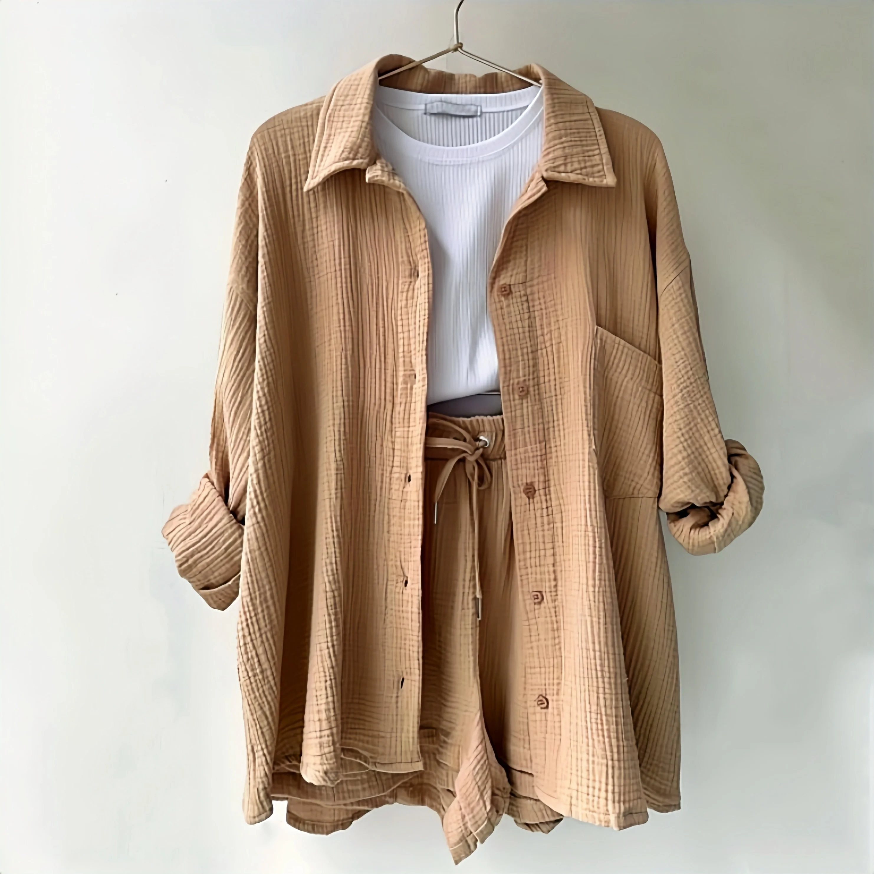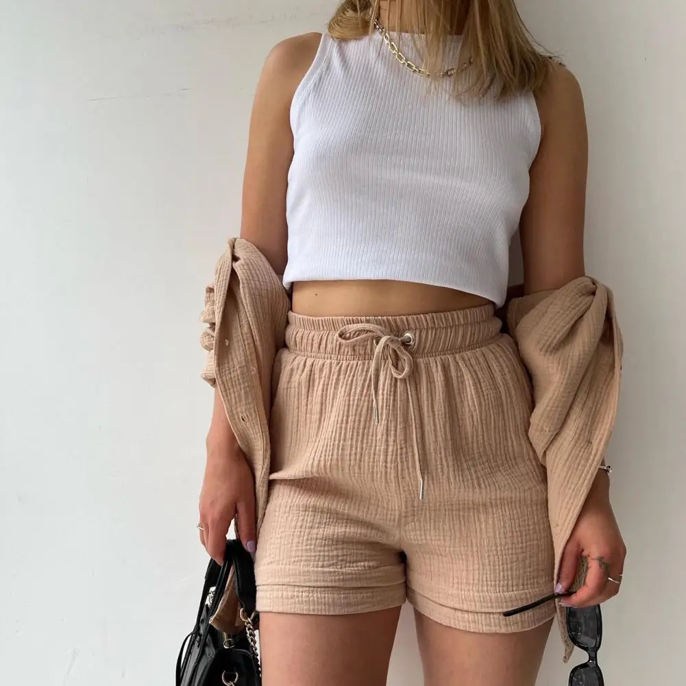 Women Casual Shirt Shorts Set Single Breasted Pocketed Top + High Waist Shorts Lady Summer Cotton Loose Fit Suit